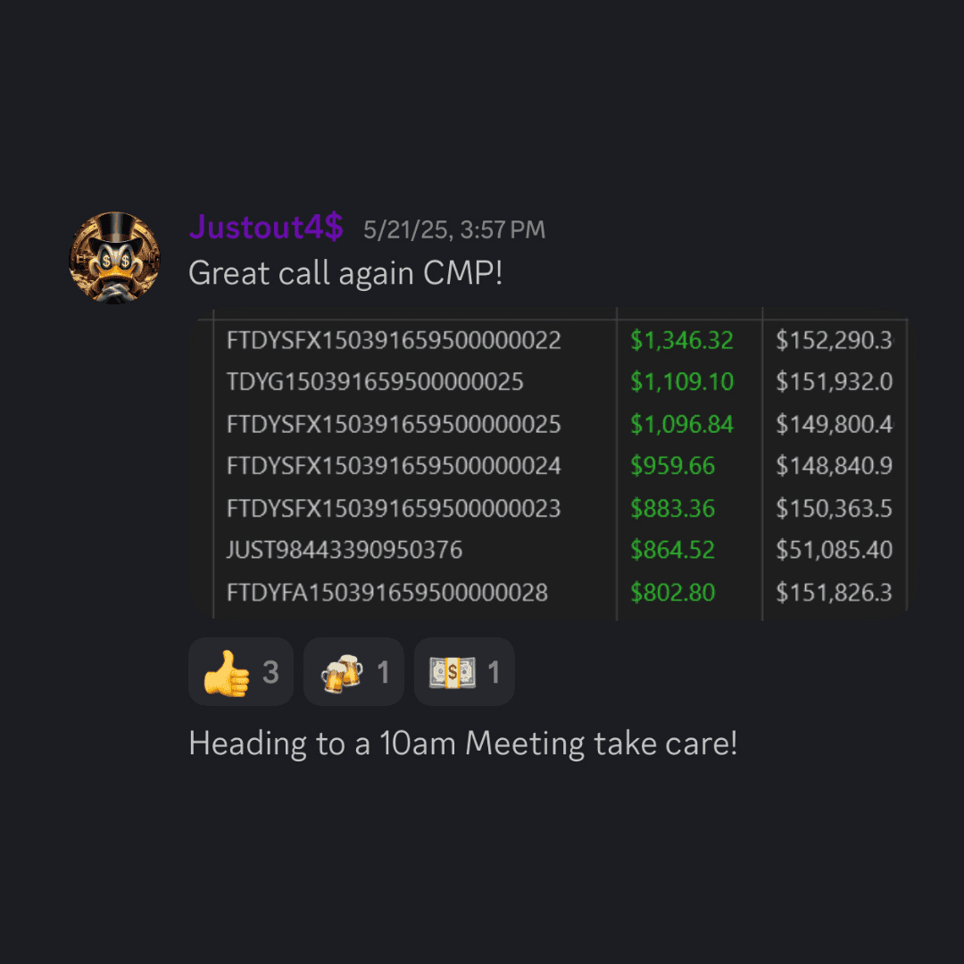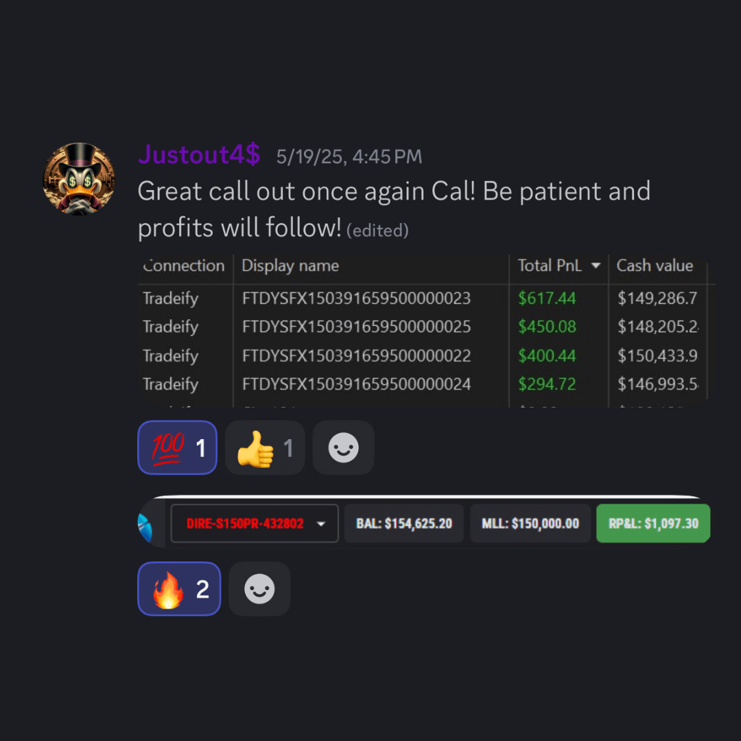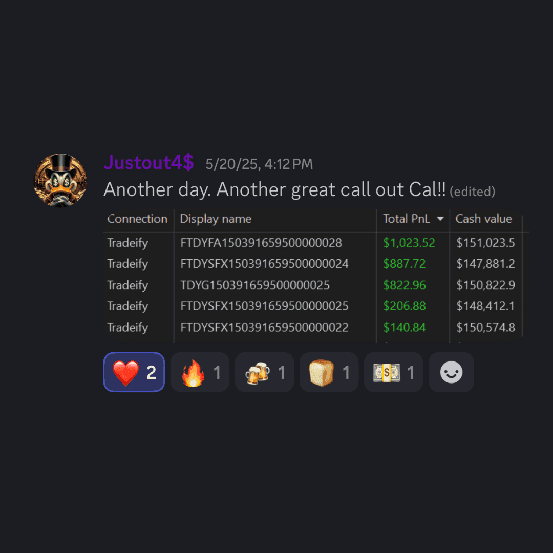 Learning setups and discipline here have been a game-changer. A $0 day beats a red one. This room provided me with clarity, value, and support. Truly the best investment I’ve made.