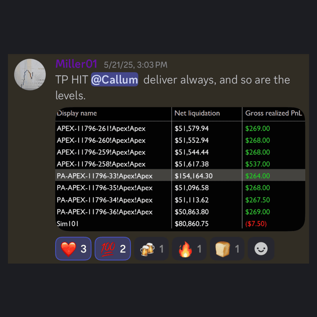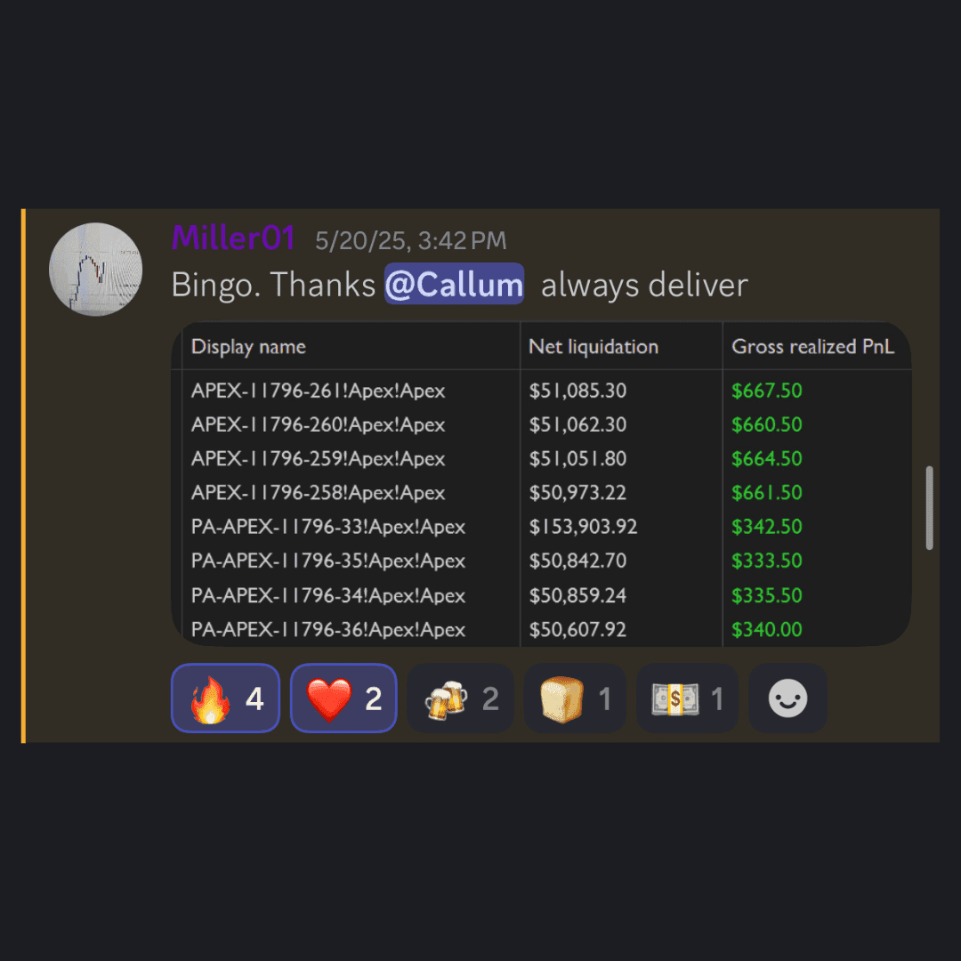 Trading with Callum for 2 years has transformed my journey. Livestreams, masterclass and focus on strategy + psychology make this group the best. Full transparency and real progress.